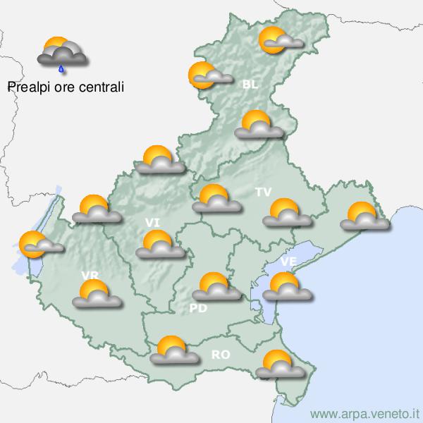 Il Veneto continua ad essere interessato da una circolazione ciclonica che determinerà condizioni di variabilità fino a martedì. Mercoledì giornata più soleggiata fino alla tarda mattinata, poi giungerà da est un nucleo depressionario che porterà una fase di tempo instabile/perturbato con aumento della nuvolosità e della probabilità di precipitazioni, che risulteranno anche diffuse a fine giornata. Giovedì la perturbazione transiterà sul Nord Italia spostandosi gradualmente verso ovest; si avranno ancora precipitazioni che tenderanno a diradarsi sui settori orientali della pianura nella seconda parte della giornata. Venerdì condizioni di residua variabilità/instabilità sulla regione, ma con miglioramento nel corso del pomeriggio con presenza di schiarite anche ampie e temperature massime in ripresa. Sabato pressione in aumento, con tempo più stabile ma parzialmente soleggiato per annuvolamenti irregolari durante le ore centrali.