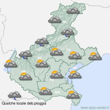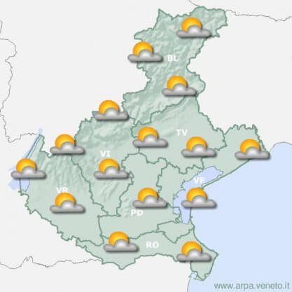 venerdì 5. In pianura cielo perlopiù poco nuvoloso con spazi di sereno anche ampi e alcuni addensamenti soprattutto dal pomeriggio a ridosso dei rilievi, in genere senza piogge; sulle zone montane moderata variabilità, con spazi di sereno alternati ad addensamenti nuvolosi soprattutto nelle ore pomeridiane, quando ivi saranno possibili alcune precipitazioni anche a carattere di rovescio; le temperature minime subiranno contenute variazioni di carattere locale, le massime in pianura aumenteranno e in montagna subiranno contenute variazioni di carattere locale.