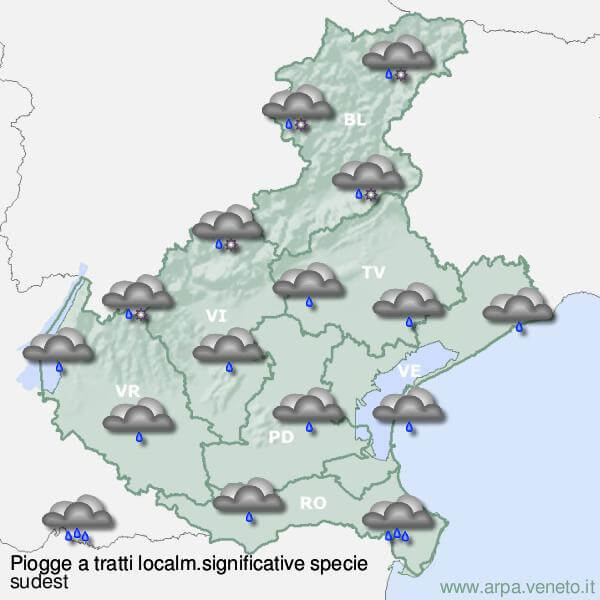 Precipitazioni. Probabilità nel complesso alta (75-100%), per fenomeni da diffusi a sparsi con locali rovesci od occasionali temporali specie in pianura; limite delle nevicate sui 1800-2100 m.