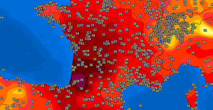 In Francia sono stati registrati più di 100 record mensili di caldo con record battuti questo lunedì pomeriggio nel sud-ovest! Per il momento, in 113 comuni la temperatura supera ogni massimo storico. Ad Orthez, ad esempio, la colonninandi mercurio ha raggiunto i 39,6°C. Altrove temperature analoghe: 38,8°C a Dax, 38,5°C a Pau, 37,4°C a Biscarrosse, 36,9°C a Tarbes; 34,7°C a Nantes, 33,8°C a Limoges, 32,9°C ad Aurillac. Nel complesso, i valori oggi sono fino a 15°C sopra le norme stagionali.