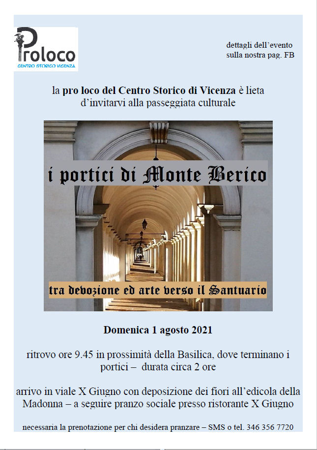 Domenica 1 agosto 2021 è in programma la passeggiata “I portici di Monte Berico tra devozione ed arte verso il Santuario”, terzo appuntamento organizzato dalla Pro loco Centro storico, patrocinato dal Comune di Vicenza e promosso da Matteo Reginato, presidente della Pro loco Centro storico e consigliere delegato all’identità veneta.