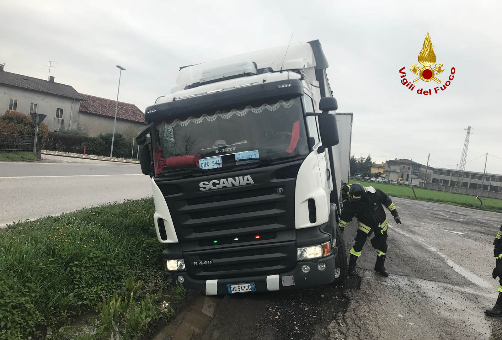 Singolare incidente oggi pomeriggio ad un tir in località Signolo a Montebello Vicentino. Alle ore 16 circa, i vigili del fuoco sono infatti intervenuti per l’assistenza al soccorso stradale ad un camion a rimorchio finito sprofondato di lato con le ruote in un piccolo scolo, che delimita il parcheggio dalla strada. L’autista si era avvicinato troppo al bordo dell’area asfaltata, sprofondando con le ruote del lato destro del mezzo fino agli assi delle ruote. I vigili del fuoco hanno prestato assistenza al personale della gru del soccorso stradale, che ha rimesso in piano il camion pieno di carta pronto a riprendere il viaggio. Le operazioni di soccorso sono terminate dopo circa un’ora e mezza.