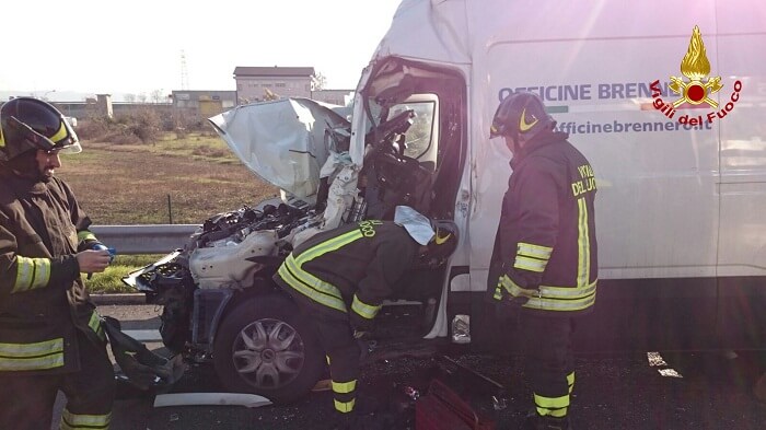 I vigili del fuoco sono intervenuti alle ore 11.40 in autostrada A4 nei pressi della rampa di uscita di Montebello in direzione Venezia per il tamponamento tra un furgone e un autoarticolato. I pompieri di Lonigo con non poche difficoltà utilizzando cesoie, divaricatori e martinetti idraulici, hanno liberato una giovane donna, rimasta intrappolata nella cabina di un Iveco Daily incastrato nella parte posteriore del semirimorchio. La donna è stata subito presa in cura dal personale del suem 118 e dopo essere stata stabilizzata è stata trasferita in eliambulanza presso l’ospedale San Bortolo di Vicenza. Durante le operazioni di soccorso l’uscita autostradale è rimasta chiusa. Sul posto la polstrada e il personale ausiliario dell’autostrada.