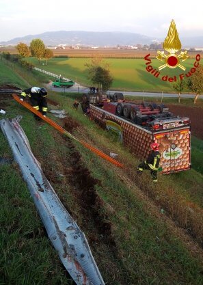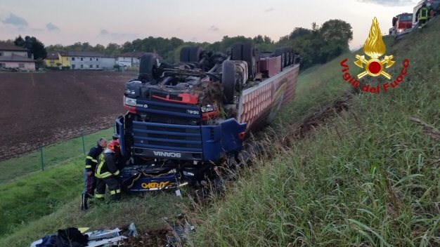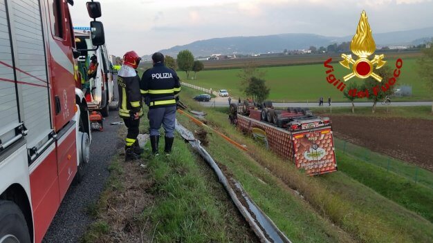 Alle ore 16, i vigili del fuoco sono intervenuti in autostrada A4 tra i caselli di Montebello e Montecchio per un autoarticolato carico di uova, finito rovesciato circa 8 metri sotto il livello stradale, dopo la perdita di controllo del mezzo da parte dell’autista, rimasto ferito insieme a un collega. I pompieri arrivati da Arzignano e Vicenza anche con l’autogrù, hanno messo in sicurezza il camion, mentre i due autisti erano già stati presi in cura dal personale del Suem 118 per essere portati in ospedale. Sul posto il personale della polstrada e quello ausiliario autostradale. Le operazioni di recupero del camion saranno effettuate durante la notte. Le operazioni di soccorso dei vigili del fuoco sono terminate dopo circa un’ora e mezza.