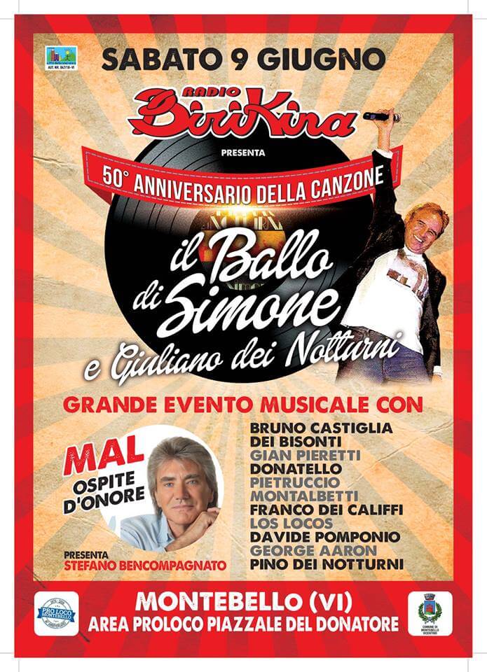 “Il ballo di Simone” compie 50 anni e Giuliano dei Notturni lo festeggia con un grande concerto nel suo paese. Grande festa domani sera a Montebello Vicentino per un brano immortale della musica italiana anni Sessanta che compie 50 anni. È “Il Ballo di Simone”, portato nel 1968 al successo dalla band Giuliano e i Notturni capitanati da Giuliano Cederle, originario e residente proprio a Montebello. Sarà lui il protagonista principale della serata di musica e spettacolo in programma a partire dalle 21 nell’area Pro Loco in Piazzale del Donatore. Con lui sul palco altri grandi protagonisti della musica di quegli anni e non solo, come l’ospite d’onore Mal e poi Bruno Castiglia dei Bisonti, Gian Pieretti, Donatello, Pietruccio Montalbetti, Franco dei Califfi, Los Locos, Davide Pomponio, George Aaron e Pino dei Notturni. La serata, promossa da Radio Birikina e patrocinata da Comune e Pro Loco, sarà presentata da Stefano Bencompagnato.