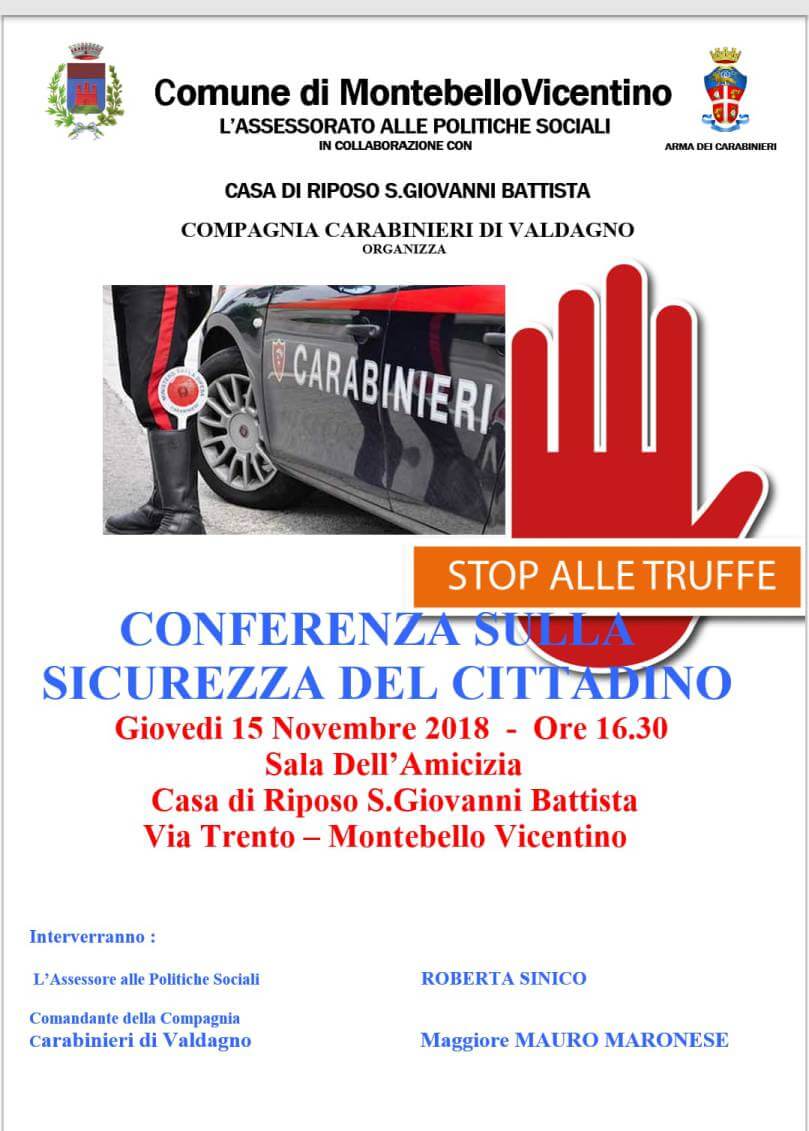 Stop alle truffe! Conferenza sulla sicurezza del cittadino. L’assessorato alle politiche sociali del Comune di Montebello Vicentino, in collaborazione con la Casa di Riposo S. Giovanni Battista e la Compagnia Carabinieri di Valdagno, giovedì 15 novembre alle 16,30, nella Sala dell’Amicizia della Casa di Riposo, propone un interessante incontro pubblico dal titolo “Stop alle truffe – Conferenza sulla sicurezza del cittadino”. Interverranno l’assessore al sociale Roberta Sinico e il Comandante della Compagnia Carabinieri di Valdagno Magg. Mauro Maronese.