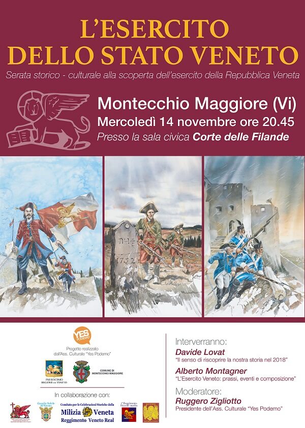 Mercoledì 14 novembre alle ore 20:45 presso la Sala Civica Corte delle Filande a Montecchio Maggiore si terrà l’evento dal titolo “L’esercito dello Stato Veneto”
