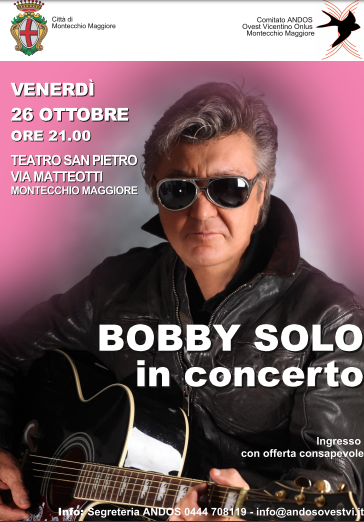 L’appuntamento è alle 21 al teatro S. Pietro (via Matteotti) per un evento speciale: Bobby Solo e la sua band si esibiranno infatti in occasione dei 20 anni del Comitato Andos Ovest Vicentino, presieduto da Piera Pozza. Il concerto è l’omaggio che il sindaco Milena Cecchetto, madrina del Comitato, e l’Amministrazione comunale hanno voluto tributare a questa associazione, da due decenni impegnata nell’assistenza alle donne operate di tumore al seno. L’ingresso al concerto sarà gratuito fino ad esaurimento posti, con offerta consapevole che sarà destinata al Comitato Andos Ovest Vicentino. Al termine dell’esibizione, Bobby Solo si intratterrà con i fan per foto e autografi, ma anche solo per scambiare qualche chiacchiera. “È un onore per noi avere in città questo grande protagonista della musica italiana – commenta il sindaco Milena Cecchetto -. Abbiamo voluto fare un regalo all’Andos per i suoi 20 anni di attività, un’associazione che quotidianamente è di aiuto a moltissime donne che vivono momenti di difficoltà, e alla sua presidente Piera Pozza. Invitiamo tutti  i cittadini a partecipare a questa grande festa che coniuga in un forte abbraccio musica e solidarietà”.