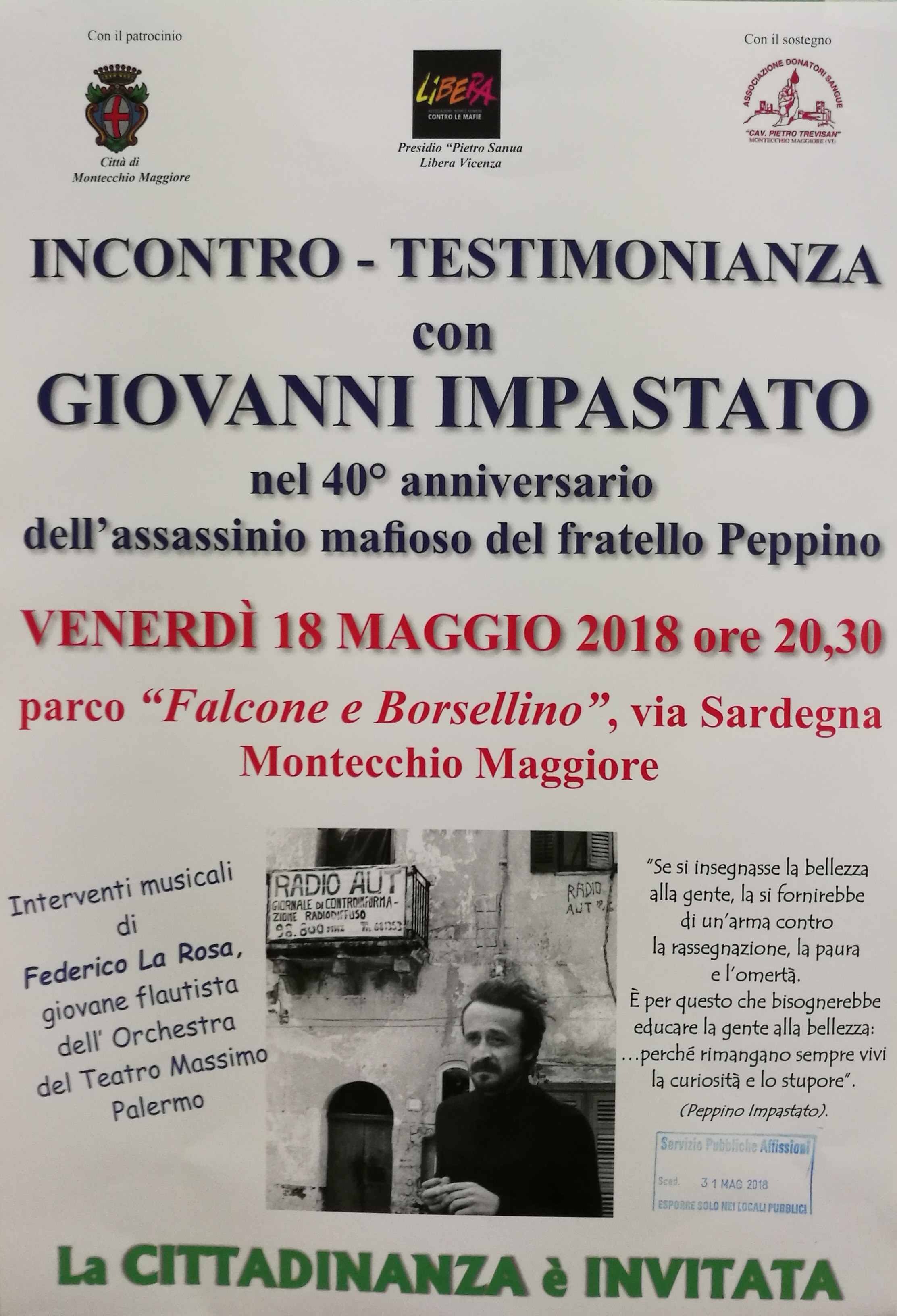 In occasione del 40° anniversario dell’assassinio per mano della mafia di Peppino Impastato, la Città di Montecchio Maggiore, l’Associazione Libera di Vicenza e l’Associazione Cav. Pietro Trevisan invitano la cittadinanza all’ incontro – testimonianza con Giovanni Impastato, fratello di Peppino.