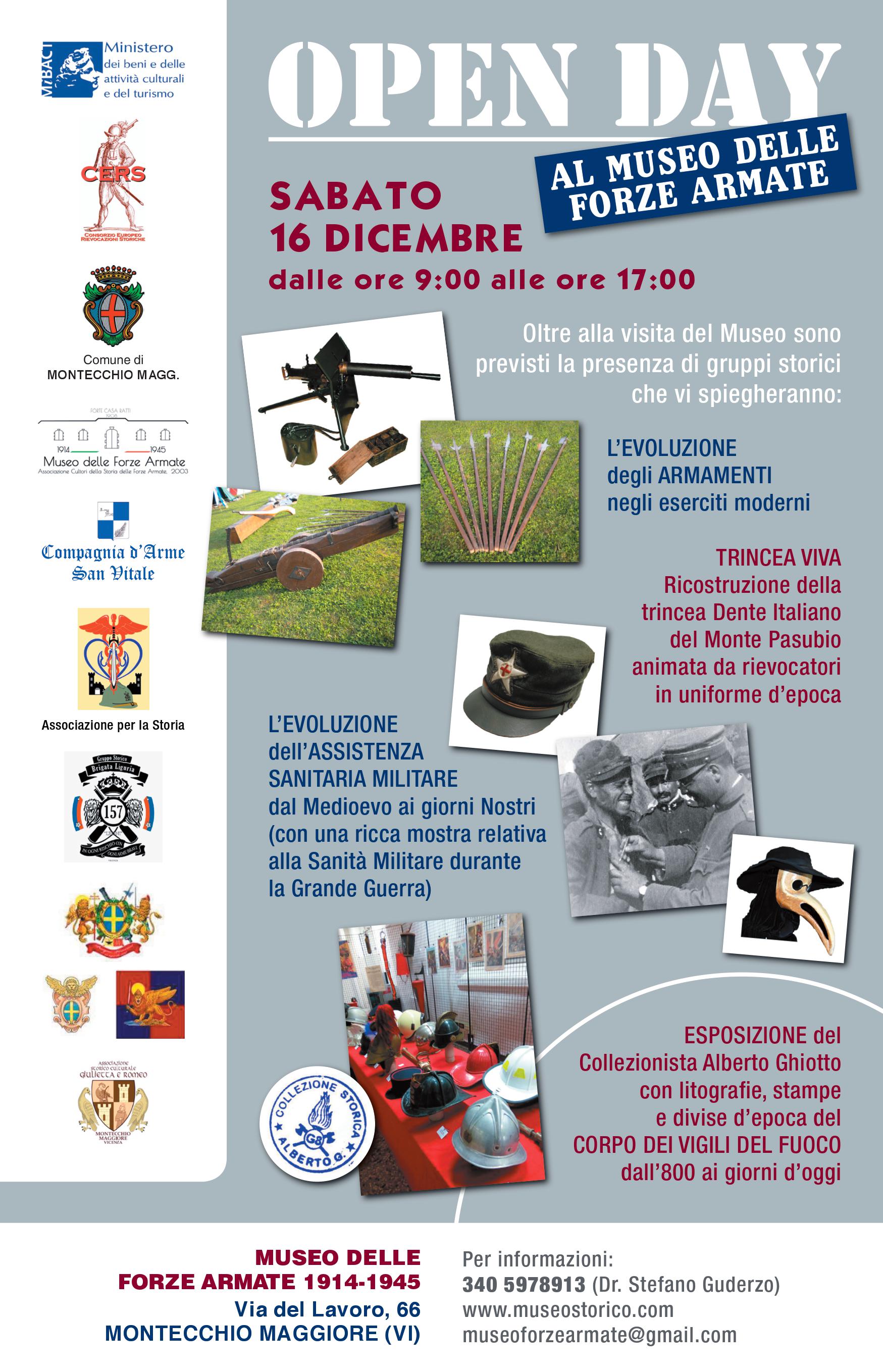 Sabato 16 dicembre dalle 9 alle 17 il Museo delle Forze Armate 1914-1945 resterà aperto con orario continuato per un evento organizzato in collaborazione con il CERS Italia e patrocinato dalla Città di Montecchio Maggiore e dal Ministero dei Beni e delle Attività Culturali e del Turismo. L’Open Day al Museo delle Forze Armate vedrà la partecipazione di diversi gruppi di rievocazione storica per una giornata dedicata alla didattica e alla comprensione. Temi della giornata saranno: l’evoluzione degli armamenti negli eserciti moderni; l’evoluzione dell’Assistenza sanitaria militare dal medioevo ai giorni nostri; l’evoluzione del Corpo dei Vigili del Fuoco dall’Ottocento ai giorni nostri; il ricordo della vita in trincea sul Dente Italiano del Monte Pasubio con i rievocatori della Brigata Liguria. La giornata va ad impreziosire la mostra temporanea “La Sanità Militare durante la Grande Guerra”, che raccoglie una ricca esposizione di materiale sanitario gentilmente concesso dal signor Erminio Scarpa (Ass. IV Novembre), a cui si sono aggiunti i prestiti temporanei di Piero Benetti (Museo III Armata di Padova) e del Ten. Col. Giorgio Castagna.