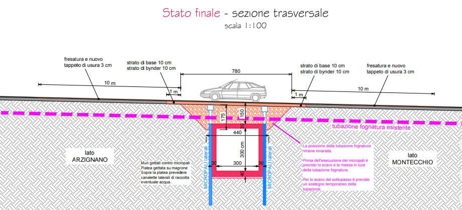 A partire da lunedì 11 maggio, la ditta appaltatrice dei lavori (Molon Graziano srl di Arzignano con il progettista e direttore dei lavori arch. Giancarlo Zarantonello), inizierà a predisporre e organizzare l’area di cantiere per l’esecuzione dell’opera. I primi interventi consisteranno nel deviare il traffico tramite un restringimento di carreggiata, tracciare i sottoservizi e demolire l’asfalto. Successivamente, a partire da lunedì 18 maggio, inizieranno gli interventi di bonifica bellica, per poi proseguire con la realizzazione vera e propria del sottopasso.