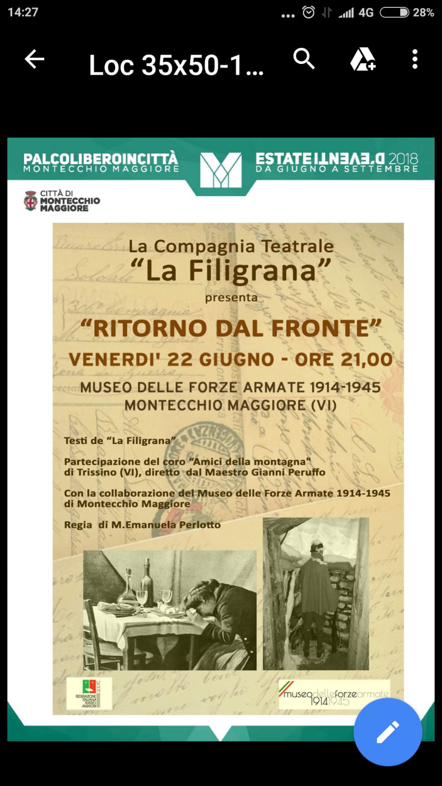 Nel centenario della prima guerra mondiale (1915-1918) la compagnia La Filigrana presenta venerdì alle 21 al Museo delle Forze Armate, lo spettacolo “Ritorno dal fronte”, per la regia di M. Emanuela Perlotto. L’allestimento, che coinvolge diciotto interpreti, è realizzato con la partecipazione del coro Amici della Montagna di Trissino, diretto dal M° Gianni Peruffo, e con la collaborazione del Museo delle Forze Armate 1914-1945 di Montecchio Maggiore. Ambientato in una corte, il lavoro è uno spaccato della vita quotidiana e delle relazioni alla fine del conflitto. Ingresso gratuito.