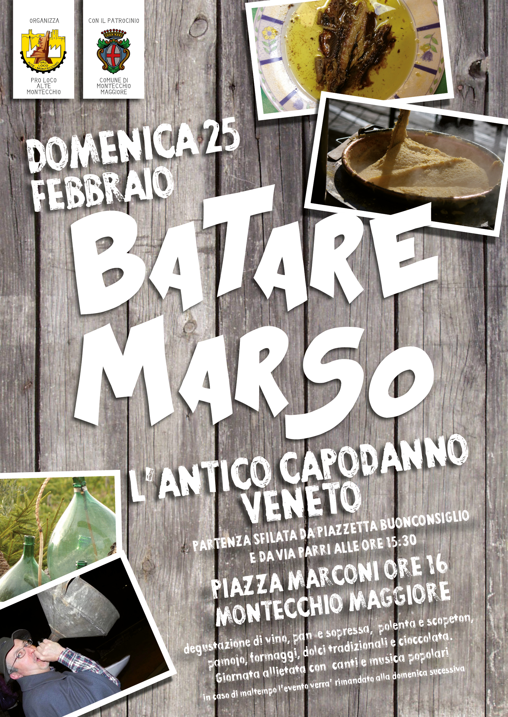 Montecchio Maggiore ritorna in piazza per festeggiare Bàtare Marso – L’antico capodanno veneto, evento organizzato dalla Pro Loco Alte – Montecchio con il patrocinio della Città di Montecchio Maggiore. L’appuntamento è domenica 25 febbraio. Alle 15,30 da Piazzetta Buonconsiglio e via Parri partirà la sfilata, che tra rumori e schiamazzi giungerà alle 16 in Piazza Marconi per celebrare il risveglio della primavera e ravvivare gli animi dopo il lungo torpore dei mesi invernali. In piazza si potranno gustare pan e sopressa, polenta e scopeton, pamojo, formaggi, cioccolata calda, vino e dolci della tradizione. Per cantare assieme a tutti i partecipanti le canzoni della tradizione saranno presenti il gruppo folkloristico dei Ballincontrà e le canterine del Feo. In caso di maltempo l’evento verrà rinviato alla domenica successiva.