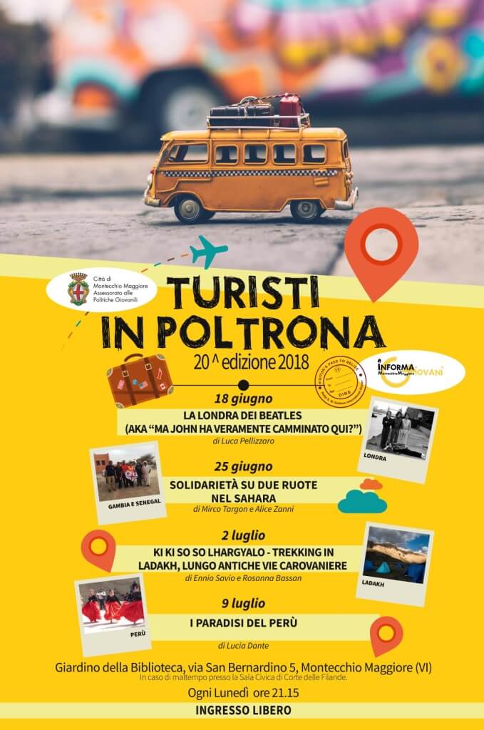 L’Assessorato alle Politiche Giovanili della Città di Montecchio Maggiore presenta la rassegna di racconti di viaggio TURISTI IN POLTRONA che quest’anno giunge alla sua 20^ edizione e sarà parte integrante del cartellone culturale Estate d’Eventi. Durante le quattro serate scopriremo la Londra dei Beatles (aka “ma John ha veramente camminato qui?”) (18 giugno), viaggeremo tra Senegal e Gambia con Solidarietà su due ruote nel Sahara (25 giugno), passeremo in Ki Ki So So Lhargyalo – trekking in Ladakh, percorrendo antiche vie carovaniere (2 luglio) fino ad arrivare a vedere I paradisi del Perù (9 luglio). Tutti gli incontri, a ingresso libero, si svolgeranno i lunedì sera dal 18 giugno al 9 luglio 2017 alle ore 21:15 presso il Giardino della Biblioteca Civica, via San Bernardino (in caso di maltempo in Sala Civica di Corte delle Filande.) L’organizzazione tecnica è a cura dell’InformaGiovani.