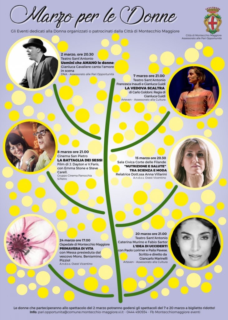 L’Assessorato alle Pari Opportunità dedica l’intero mese di marzo alle donne con un cartellone di eventi, dal titolo “Marzo per le donne”, organizzati o patrocinati dalla Città di Montecchio Maggiore.