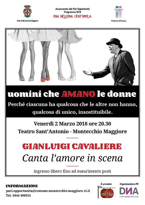 Si parte il 2 marzo alle 20,30 al Teatro S. Antonio con lo spettacolo “Uomini che AMANO le donne” che vedrà Gianluca Cavaliere in scena per cantare l’amore verso le donne (v. comunicato allegato). L’organizzazione è a cura di DNA e dell’Assessorato alle Pari Opportunità.