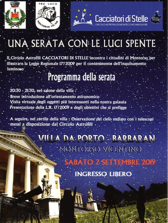 Sabato 7 settembre alle 20,30 sarà la volta della “Serata con le luci spente”, organizzata dal Circolo Astrofili “Cacciatori di stelle” di Montecchio Maggiore con il patrocinio di Comune e Pro Loco. Gli astrofili incontreranno i cittadini per fornire una breve introduzione all’orientamento astronomico, condurli in una visita virtuale degli oggetti più interessanti della nostra galassia ed illustrare la Legge Regionale 17/2009 per il contenimento dell’inquinamento luminoso.