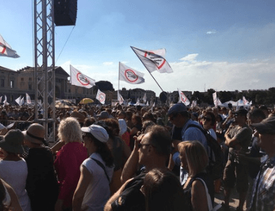 Dopo il raduno di sabato a Roma ieri è stato il Prato della Valle di Padova ad ospitare i “negazionisti”, che con bandiere e senza mascherina hanno manifestato la loro rabbia contro chi, sostengono, cerca di “sovvertire l’ordine sociale” usando la “grande bugia” del Coronavirus.