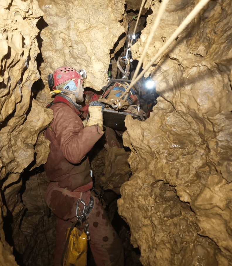 Durante le operazioni si è simulato il raggiungimento e il salvataggio di uno speleologo infortunato alla profondità di 300 metri dall’ingresso della cavità.