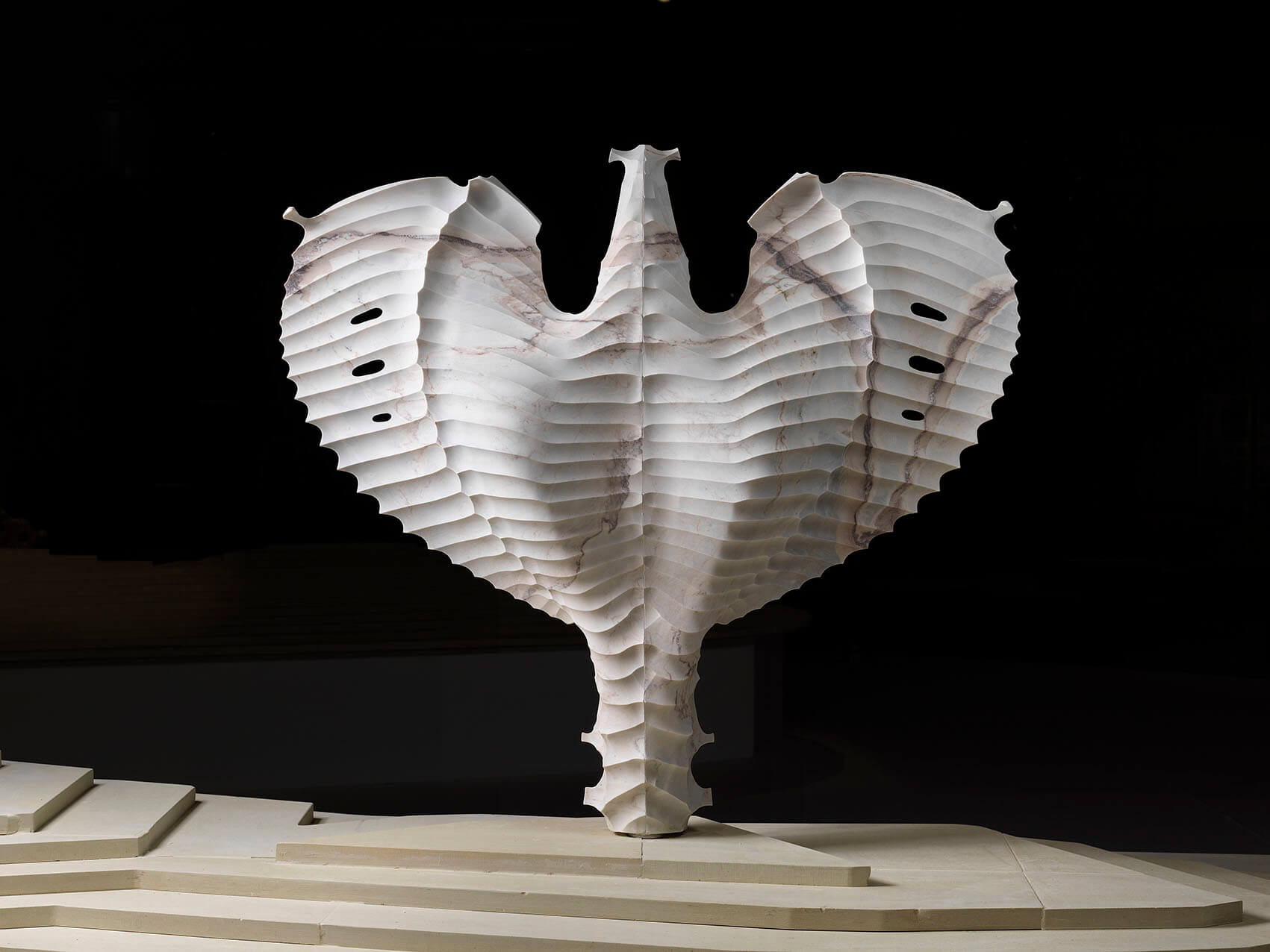 Le opere, realizzate con marmi pregiati, s’ispirano alle affascinanti forme della natura, alle strutture ossee dei vertebrati, alle simmetrie cromatiche delle livree e alla seghettatura marginale delle foglie.