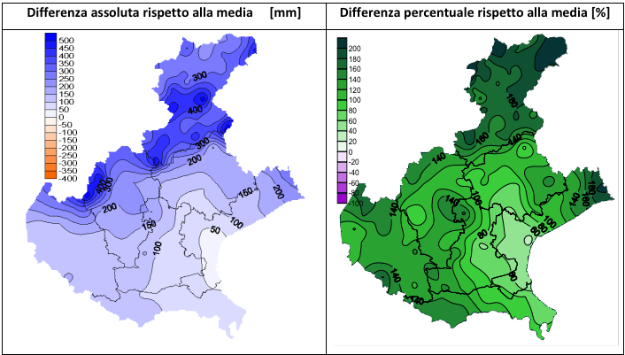 Sulla maggior parte della regione gli apporti di pioggia sono stati superiori alla media del 100% (quindi valori