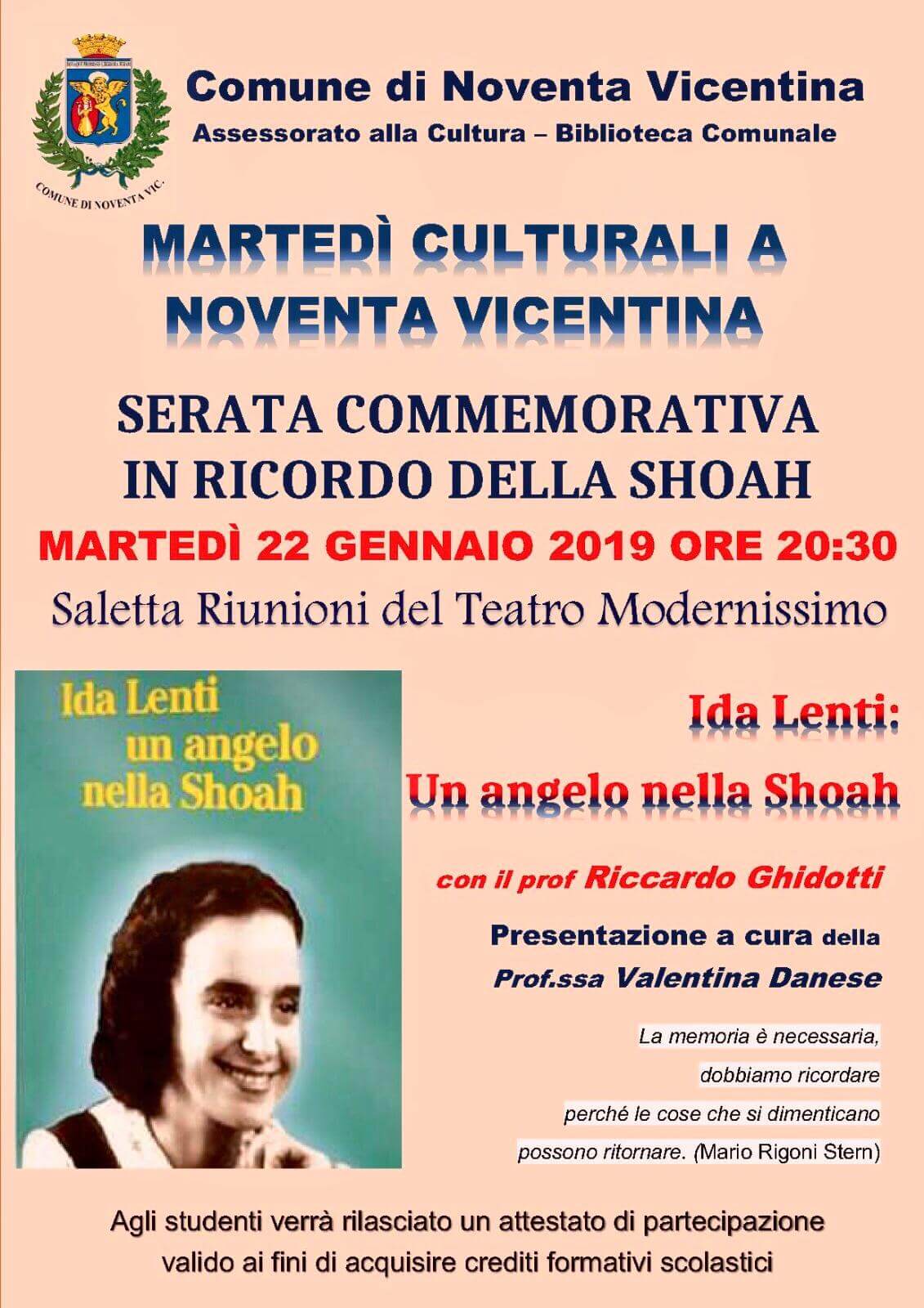 Per commemorare la Giornata della Memoria che ricorre il 27 gennaio, il Comune promuove una serata culturale Martedì 22 Gennaio alle ore 20:30 presso la Saletta riunioni del Teatro Modernissimo con il Prof. Riccardo Ghidotti che presenterà il suo libro “Ida Lenti un angelo nella Shoah”, testimonianza di una storia locale poco conosciuta ma di grande valore etico e morale.