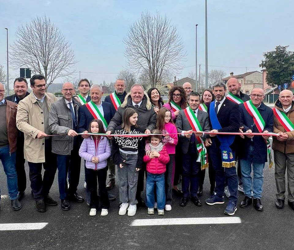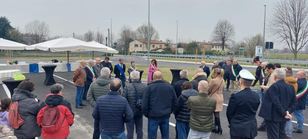 Domenica 17 marzo a Noventa Vicentina, il sindaco Mattia Veronese con i colleghi primi cittadini dell’area, con i rappresentanti delle istituzioni provinciali e regionali, con i referenti delle associazioni di categoria e con i tecnici e dipendenti della ditta costruttrice, ha inaugurato la rotatoria in via Bergoncino a Noventa Vicentina (SOTTO: LE FOTO). Un’opera di oltre 500mila euro, frutto di importanti contributi della Provincia di Vicenza e della Regione del Veneto. Questo intervento, oltre a garantire il passaggio in sicurezza degli utenti della strada in entrata e uscita dal paese, è fondamentale per il transito dei numerosi mezzi pesanti che passano tutti i giorni nella vicina zona industriale e artigianale. Ecco il motivo della sua forma allungata ad “effetto spartitraffico”.