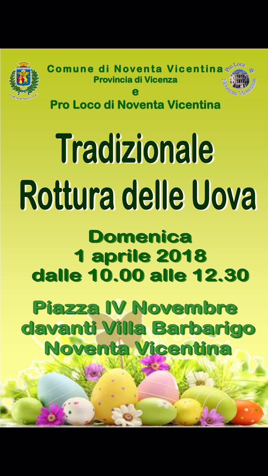 Domenica 1 aprile, in occasione della Pasqua, la Proloco di Noventa Vicentina dalle ore 10.00 Vi aspetta davanti a villa Barbarigo, sede comunale, per la tradizionale “Rottura delle uova”. Una manifestazione secolare di buon auspicio che è occasione per uno scambio di auguri all’insegna del divertimento! Una gara in cui tutti possono partecipare, grandi e piccoli, con premi di cioccolata per i vincitori. Un ringraziamento ai volontari della Proloco per l’impegno profuso nel proseguire questa singolare e storica iniziativa! In caso di maltempo la gara si svolgerà sotto ai portici.