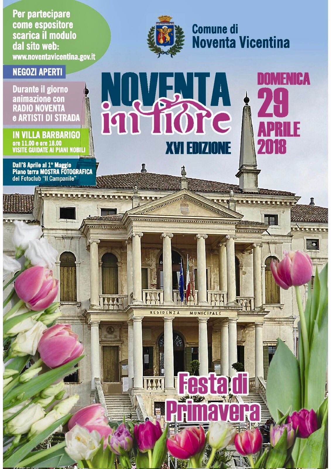 Noventa in Fiore è giunta alla 16 esima edizione e si svolgerà domenica 29 aprile in piazza IV Novembre e lungo le vie del centro. Durante la giornata una vasta esposizione con stand di fioristi, vivaisti e oggettistica per giardino allieterà la piazza del paese. L’animazione in piazza sarà curata da Radio Noventa, con la presenza di artisti di strada. I negozi del centro saranno aperti per tutta la giornata. Sarà inoltre possibile fare una visita guidata di Villa Barbarigo alle ore 11.00 e alle ore 18.00 con mostra fotografica a cura del FotoClub il Campanile sita nelle sale espositive del Comune.