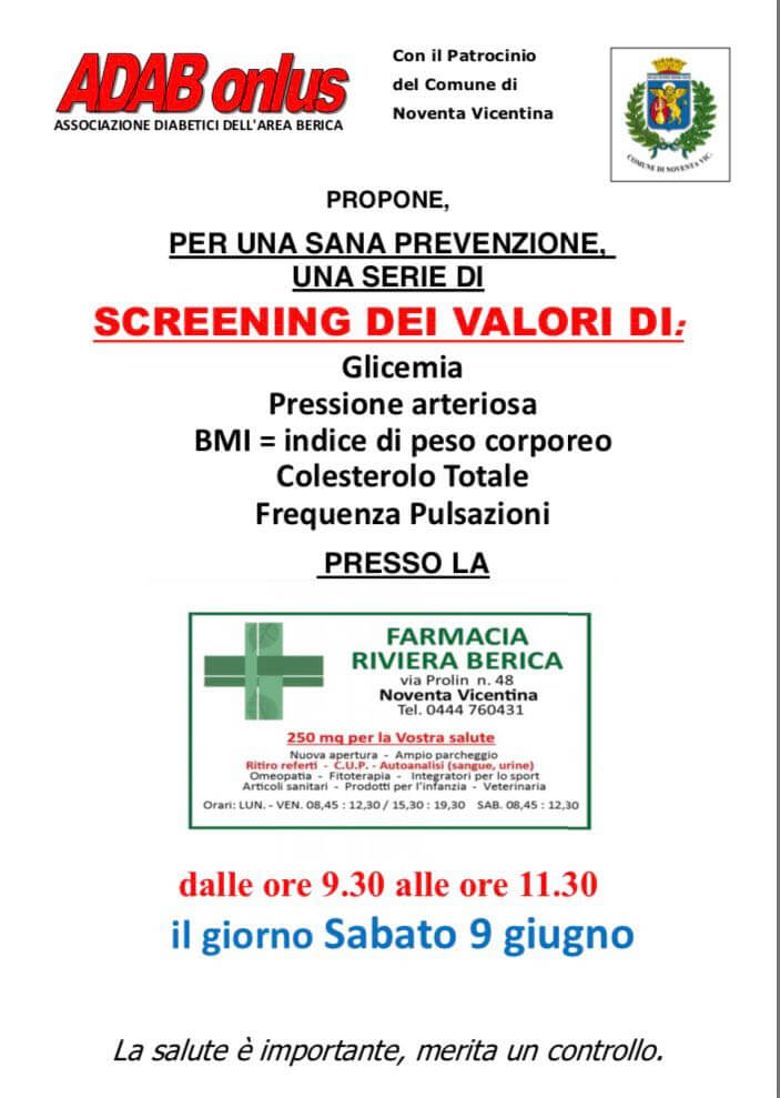 Mattinata di prevenzione domani, sabato 9 giugno dalle ore 9,30 alle 11,30, a cura dell’Associazione Diabetici Area Berica (ADAB Onlus) a Noventa Vic.na presso i locali della Farmacia Riviera Berica (via Prolin, 48). Screening gratuito per tutta la cittadinanza.