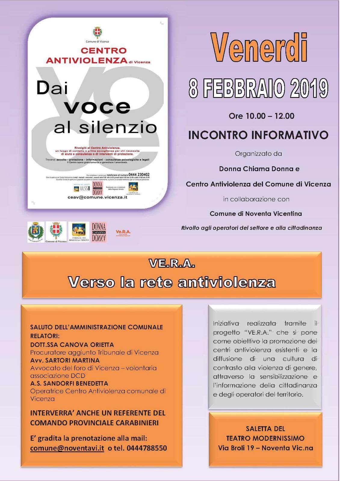 Venerdì 8 febbraio il Centro antiviolenza del Comune di Vicenza e l’associazione Donna chiama donna, in collaborazione con il Comune di Noventa Vicentina, nel confermare il proprio sostegno alla lotta contro la violenza sulle donne, organizza un incontro informativo rivolto agli operatori del territorio (assistenti sociali, medici di base, forze dell’ordine) e alla cittadinanza.