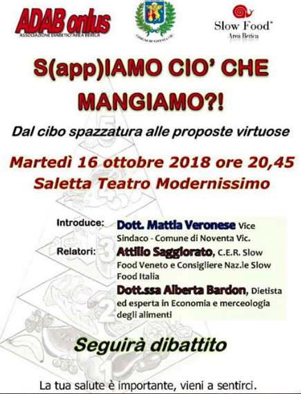 Questa sera, martedì 16 ottobre, alle ore 20.45 in saletta adiacente al Teatro Modernissimo, l’Associazione Diabetici dell’Area Berica e la condotta locale di Slow Food presentano il convegno: “S(app)iamo cosa mangiamo?”. Un momento formativo e di riflessione sulle scelte alimentari quotidiane. Interverrà la dott.ssa Alberta Bardon, dietista ed esperta in economia e merceologia degli alimenti.