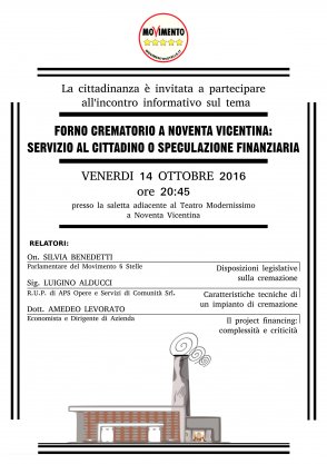 “Condivido la contrarietà espressa dai cittadini alla costruzione dei forni crematori a Noventa Vicentina e a Cervarese S. Croce decisa dalle rispettive amministrazioni comunali. Sottolineo che non vi è nulla di pregiudiziale in tale posizione e che l’allarmismo sollevato ha fondate ragioni, considerate le evidenti zone d’ombra che accompagnano questi progetti, su cui il M5S ha presentato una interrogazione in Regione. La gente ha il diritto ed il dovere di volerci vedere chiaro, di conoscere fino in fondo le conseguenze che questi impianti avranno sia sul piano ambientale e della salute che su quello economico. Per fare luce sull’intera vicenda si stanno organizzando nel territorio appuntamenti informativi e discussioni molto utili con la presenza di esperti nel settore. I cittadini vogliono essere parte attiva in decisioni di questo tipo dunque l’ultima parola è giusto che spetti a loro. Chiediamo che anche a Noventa Vicentina si segua l’esempio di Cervarese e il sindaco ritiri la delibera”. È quanto propone la deputata padovana Silvia Benedetti (M5S) che interverrà nella serata informativa in programma venerdì 14 ottobre ore 20:45 a Noventa Vicentina.