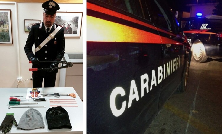 I militari hanno subito proceduto al controllo; a seguito di una perquisizione d’iniziativa, hanno quindi rinvenuto degli attrezzi atti allo scasso, nello specifico cacciaviti, coltelli, tronchese nonché’ un passamontagna, guanti ed un berrettino.