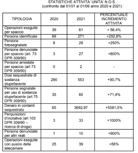 Dal primo gennaio al primo giugno del 2021 sono 61 le operazioni antidroga realizzate dai sei agenti del Nos. Gli interventi sono stati 39 nello stesso periodo del 2020, un dato condizionato anche dal fatto che nei mesi di marzo e aprile gli agenti sono stati impiegati soprattutto nei controlli per il rispetto della normativa anti Covid-19.