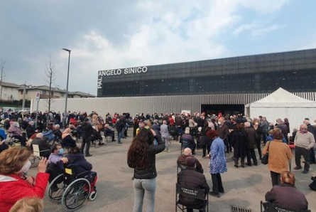 E’ stato preso d’assalto oggi il centro vaccinale allestito a Trissino, presso il nuovo palazzetto dello sport. Anziani over 80 con relativi accompagnatori sono accorsi da tutto l’Ovest Vicentino, rimanendo in fila per 2-3 ore di media. La chiamata era per le classi di età dal 1933 al 1937, ma i vaccini erano disponibili come da iter anche per ogni singolo accompagnatore. Non sono mancate le polemiche sia in loco che nei social network, dove le foto sono state condivise da centinaia di persone, di chi ha dovuto aspettare per ore sotto il sole e senza nemmeno un appoggio: dopo ore sono arrivate anche delle sedie in supporto, ma chi c’era testimonia una situazione insostenibile per gli anziani presenti ad attendere. Si sono, dunque, create lunghe file e attese di ore all’esterno dell’hub e diversi cittadini sono stati invitati a ripresentarsi domani, lunedì 28 marzo, per la somministrazione della dose. Molti sono stati invitati a ripresentarsi domani.
