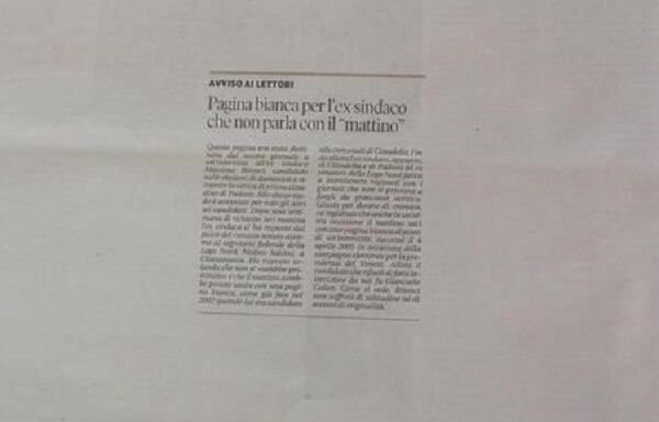 Un candidato sindaco rifiuta l’intervista e la pagina a lui dedicata resta bianca o quasi. Lo ha deciso il Mattino di Padova che oggi aveva riservato la pagina 24 all’ex sindaco della città del Santo Massimo Bitonci nuovamente in corsa per le amministrative di domenica prossima.