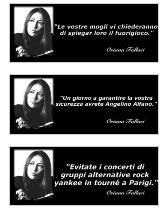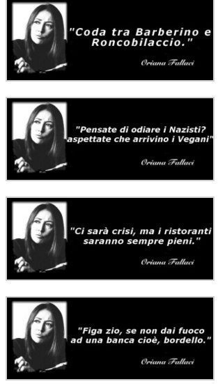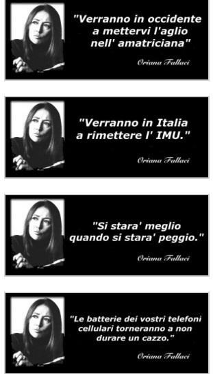 In tutto questo, non è passata inosservata la puntuale riesumazione della salma di Oriana Fallaci, chiamata a esprimersi come un oracolo, con citazioni e profezie e, a catena, l’ironia di chi ha sempre considerato estremistiche le sue posizioni o di chi non sopporta il citazionismo spesso basato sulla mancata lettura dei testi della scrittice. In questo post vi riproponiamo alcune delle versioni ironiche di tale riesumazione. Dissacranti? Sì… ma con un’utilità: chiedere un minuto di silenzio anziché caricare in maniera spasmodica lezioni di politica internazionale e orientare alla propria causa politica avvenimenti che non possono diventare oggetto di querelle fra politici di terzordine, mancati segretari di partito ora impiegati alle poste e dattilografi da social.