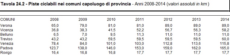 Padova è il capoluogo che guida il gruppo di città italiane in cui è più elevata la rete di piste ciclabili. Lo afferma l’Istat nella fotografia sul cambiamento dei sistemi di mobilità nel 2014, che ha visto il “boom” del car sharing (ormai presente in 23 città, con oltre 4 mila veicoli) e il bike sharing, che nel Paese supera quota 11 mila bici in 60 città, raddoppiando i numeri del 2011. Si allunga intanto la rete delle piste ciclabili, presenti in 105 capoluoghi di provincia (erano 89 nel 2008). Le dotazioni più elevate si registrano a Padova, Torino, Brescia, Mantova, Pordenone e Modena, tutte città del Nord. Anche sulle nuove forme di mobilità, infatti, il Sud è in ritardo. Nella tabella sotto i dati relativi alle città Venete. Si nota come Vicenza sia indietro rispetto agli altri grandi capoluoghi veneti. A Padova il triplo delle piste ciclabili rispetto a Vicenza (165 km contro 58). A Venezia il doppio (115). Verona è la terza di questa classifica con 89 km mentre Treviso è quarta (60). Al quinto posto Vicenza (58,2), seguita da Rovigo (17,7) e la montana Belluno (11)