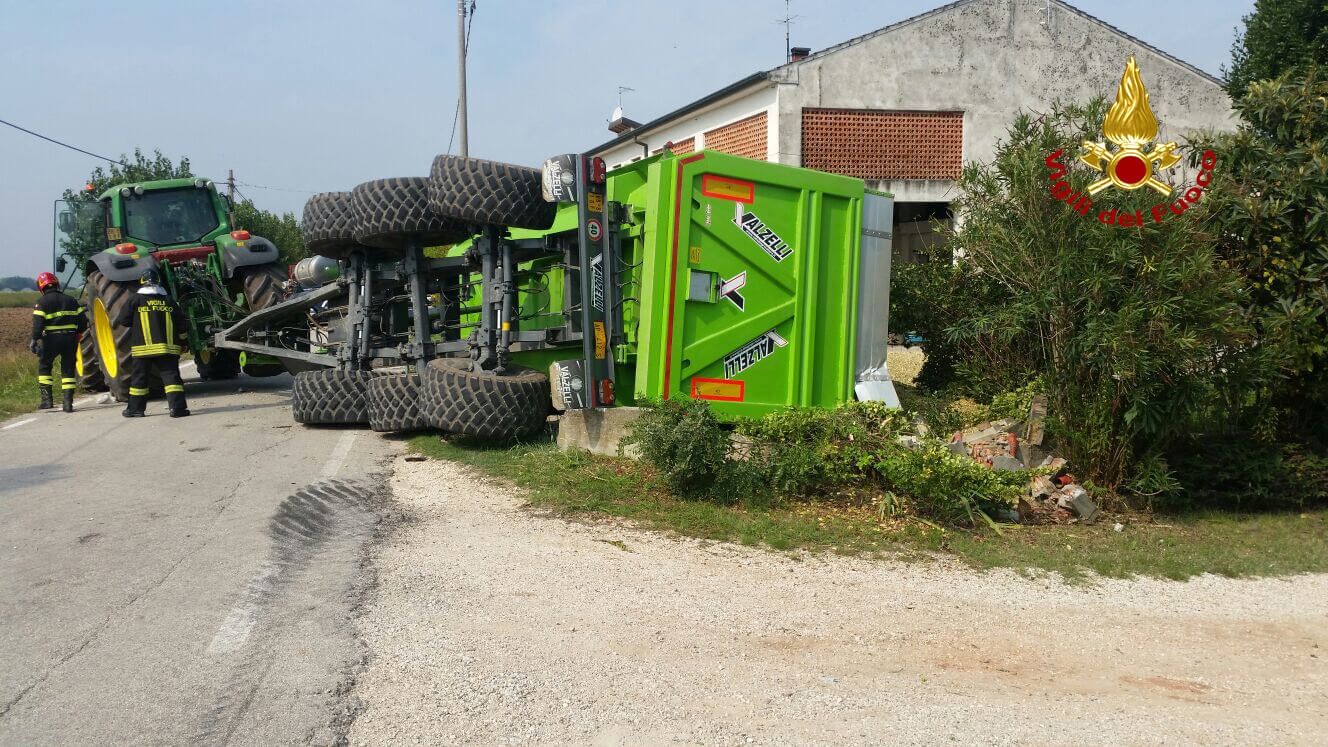 Poco dopo mezzogiorno, i vigili del fuoco sono intervenuti in via Ponte Nuovo a Poiana Maggiore per il ribaltamento di un rimorchio agricolo carico di mais: illeso l’uomo alla guida del trattore. L’agricoltore stava percorrendo la strada alla guida del trattore quando il rimorchio trainato si è rovesciato piegando prima un palo dell’enel e poi abbattendo la recinzione di un’abitazione e danneggiando un passo carraio: non si esclude che la causa del ribaltamento sia dovuta a un cedimento meccanico. I vigili del fuoco intervenuti da Lonigo e da Padova con l’autogru hanno lavorato circa tre ore per recuperare il rimorchio. Durante le operazioni di soccorso la strada è rimasta chiusa. Sul posto la polizia locale del basso vicentino per i rilievi e la deviazione del traffico.