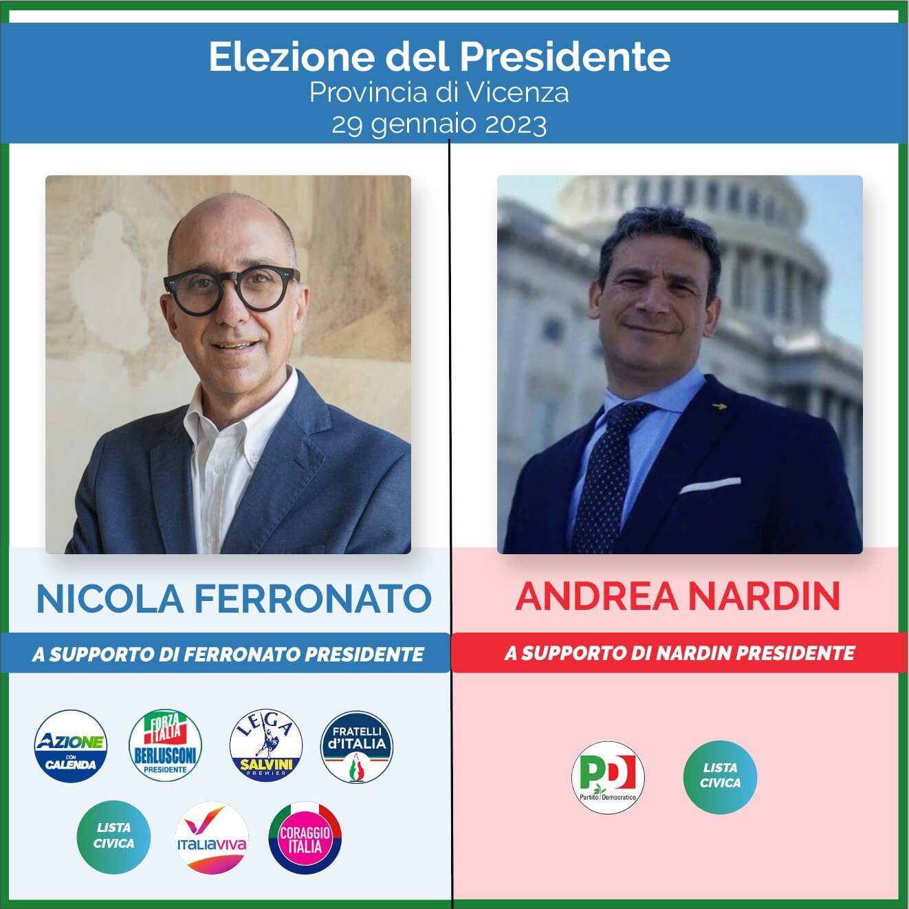 La storia recente è risaputa. Poco meno di una trentina i sindaci candidabili, un tavolo tra rappresentanze civiche e partitiche, alla fine non si trova il punto di accordo fra tutti e si va alla conta tra il sindaco di Caldogno, Nicola Ferronato, sostenuto da un gruppo di civici che hanno come riferimento il Primo Cittadino di Camisano, Renzo Marangon, il Centrodestra allargato al Terzo Polo (Fratelli d’Italia, Lega, Forza Italia, Coraggio Italia, Azione e Italia Viva) e, dall’altra parte, il sindaco di Montegalda, Andrea Nardin, sostenuto dal PD e dai civici che fanno riferimento al sindaco di Schio, Valter Orsi.