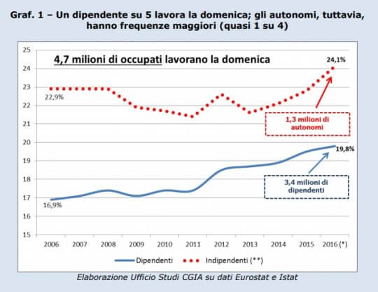 Secondo un’analisi realizzata dall’Ufficio studi della CGIA e riferita al 2016, sono 4,7 milioni gli italiani che lavorano di domenica. Tra questi 4,7 milioni, 3,4 sono lavoratori dipendenti e gli altri 1,3 sono autonomi (artigiani, commercianti, esercenti, ambulanti, agricoltori, etc.). Se 1 lavoratore dipendente su 5 è impiegato alla domenica, i lavoratori autonomi, invece, registrano una frequenza maggiore: quasi 1 su 4 (vedi Graf. 1).
