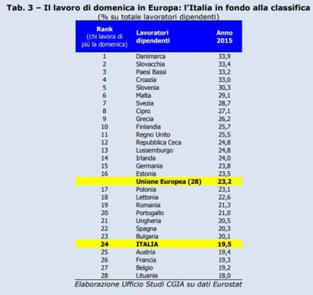 Rispetto agli altri paesi europei, comunque, l’Italia si posiziona negli ultimi posti della classifica tra chi lavora di domenica. Se nel 2015, in riferimento ai lavoratori dipendenti, la media dei 28 paesi Ue era del 23,2 per cento – con punte del 33,9 per cento in Danimarca, del 33,4 per cento in Slovacchia e del 33,2 per cento nei Paesi Bassi – da noi la percentuale era del 19,5 per cento. Solo Austria (19,4 per cento), Francia (19,3 per cento), Belgio (19,2 per cento) e Lituania (18 per cento) presentavano una quota inferiore alla nostra (vedi Tab. 3).