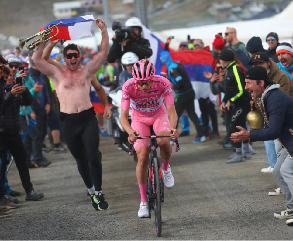 Una magia, come accennato, fatta anche del colore delle “divise” degli spettatori (spesso addobbati di tutto punto come i professionisti), e, perché no, anche di qualche cartello, come quello che ho visto sabato esibito da un tifoso sulle strade del Monte Grappa che diceva: “Più bei de Tadej ghe xe solo i schei”.