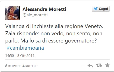 “Valanga di inchieste alla Regione Veneto. Zaia risponda: non vede, non sente, non parla. Ma lo sa di essere Governatore?». Questa la micidiale frecciata che la Moretti lancia con la tastiera del telefono. Commenta così l’ultima inchiesta della Guardia di Finanza che come un ciclone si è abbattuta ieri su Venezia. Un’inchiesta che ha coinvolto anche un funzionario della Regione e due ex assessori. Una mossa che già si interpreta come una formale scesa in campo L’hashtag usato è #cambiamoaria.