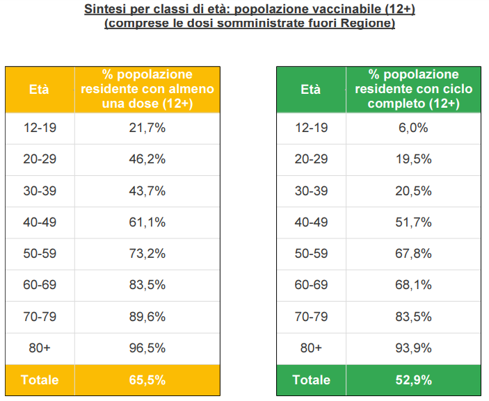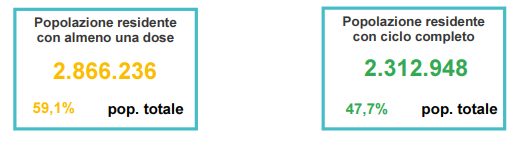 In aumento rispetto ai giorni precedenti le prime dosi, man mano che si esauriscono i richiami Astrazeneca per chi aveva fatto la prima dose tre mesi fa. Il 47.7% della popolazione è completamente vaccinato, mentre il 59.1% della popolazione ha ricevuto almeno una dose.