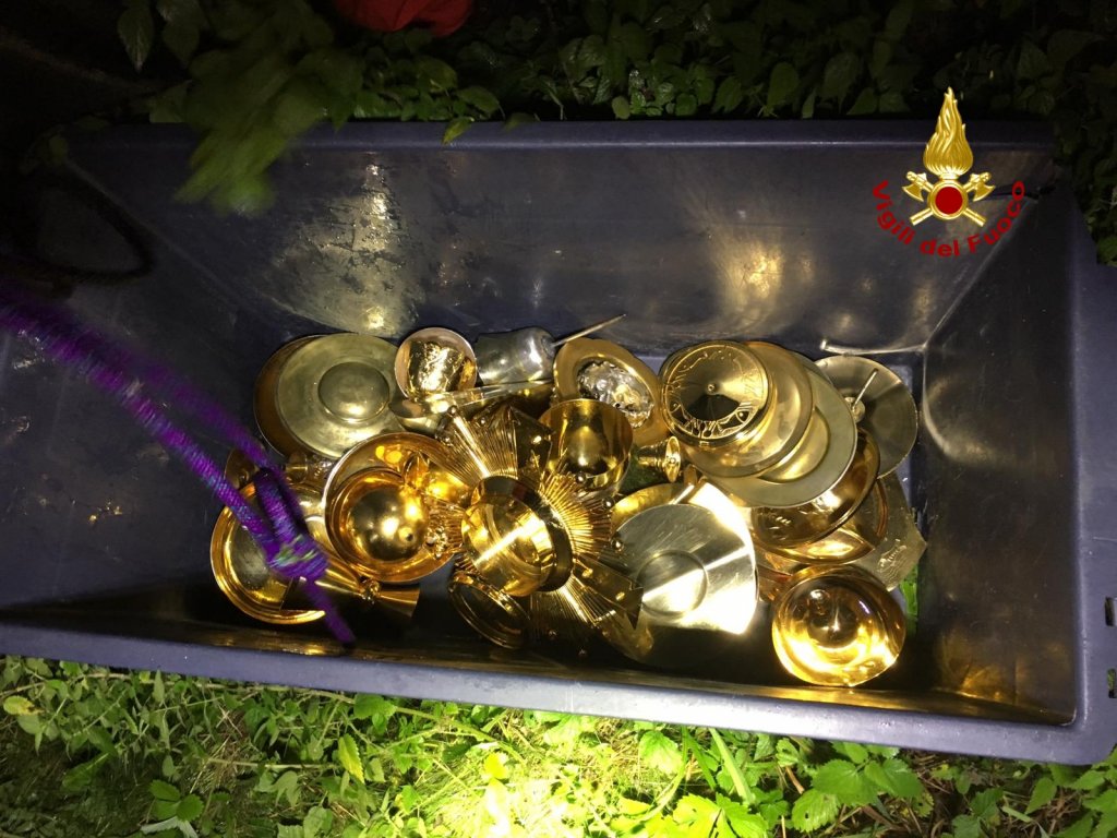 Ieri sera, i vigili del fuoco sono intervenuti a Chiuppano su richiesta dei carabinieri per il recupero di alcuni oggetti liturgici buttati all’interno di una roggia, che affianca il torrente Astico. I diversi manufatti sacri probabilmente trafugati in qualche Chiesa erano stati visti da un signore, il quale ha avvertito i carabinieri. I vigili del fuoco arrivati sul posto anche con il nucleo sommozzatori di Venezia, hanno recuperato a circa un metro di profondità i diversi oggetti sacri presi in custodia dai militari dell’arma per l’individuazione dei legittimi proprietari.