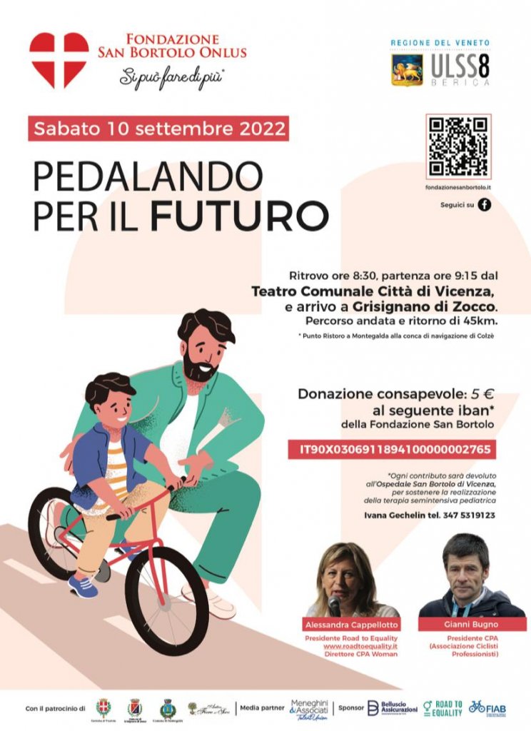 Importante evento sportivo e solidaristico sabato a Vicenza. In programma la Pedalata per il Futuro per ringraziare il personale sanitario e promuovere le attività della Fondazione San Bortolo. È prevista una pedalata da Vicenza a Grisignano con breve fermata all’Ospedale di Vicenza, insieme ai campioni mondiali Gianni Bugno e Alessandra Cappellotto.