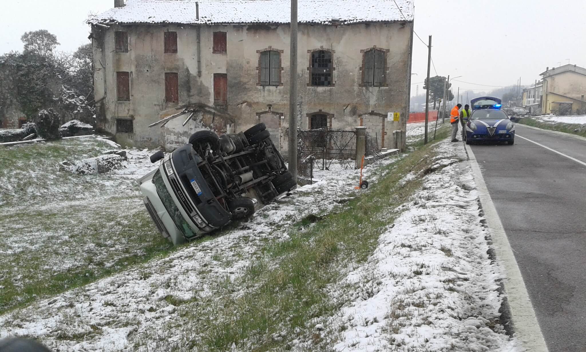 Una combinazione di neve e ghiaccio ha fatto sbandare e ribaltare un autocarro stamattina a Sarcedo. Verso le 1o, in via Togarelli, W.A.G.C., 36 anni, autista di un camion, per evitare un’auto che stava sbandando nell’opposto senso di marcia, ha perso il controllo del mezzo e si è ribaltato nel fossato vicino alla strada. Una pattuglia della Polizia Nordest vicentino è intervenuta per i rilievi di rito. Fortunatamente non ci sono stati feriti.