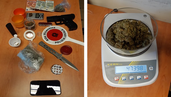 Hanno così constatato che un soggetto, mentre stava parlando con due ragazzi, dei quali uno risultava poi minorenne, aveva in mano un sacchettino contenente, presumibilmente, marijuana. Dopo pochi istanti estraeva dalla tasca dei pantaloni un coltello a serramanico, per poi sguainarlo e mostrarlo ai presenti. A quel punto gli Agenti in borghese chiedevano l’intervento di una pattuglia che giungeva da monte, cinturando a loro volta la zona da sotto. Il giovane in questione, identificato in Riccardo DALLA COSTA, 20enne di Schio, consegnava subito un sacchetto contenente g. 8,124 netti di Marijuana. Quindi, sempre a richiesta, consegnava il coltello a serramanico, risultato avere lama lunga cm. 12. Gli agenti chiedevano poi di chi fosse un ciclomotore che era parcheggiato poco distante. Il giovane rispondeva di non saperlo, ma da accertamenti alla banca dati, la targa risultava intestata al padre del medesimo. Dopo avere inventato varie scuse per non aprirlo, quali non avere la chiave e che non funzionava la serratura, alla fine il giovane collaborava aprendo il vano sottosella, nel quale veniva rinvenuto un involucro contenente g. 47,398 netti di Marijuana. Si procedeva quindi alla perquisizione del suo zaino, nel quale venivano rinvenuti g. 49,915 netti di Hashish (suddivisi in due contenitori dei quali uno in vetro con circa 44 grammi, e l’altro in plastica con circa 5 grammi), un bilancino elettronico di precisione, una pistola giocattolo priva però di tappo rosso, un coltellino multiuso.